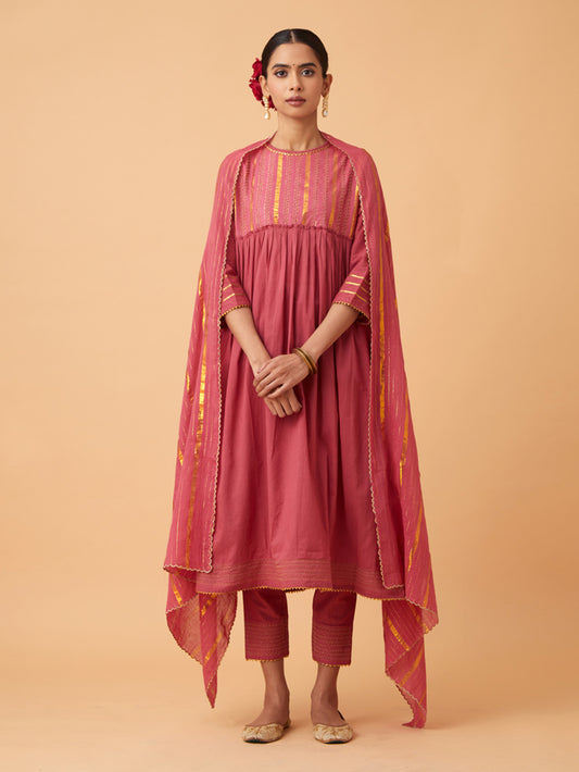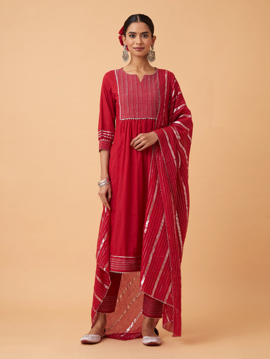Red Cotton Kurta with Pants and Dupatta Set of 3