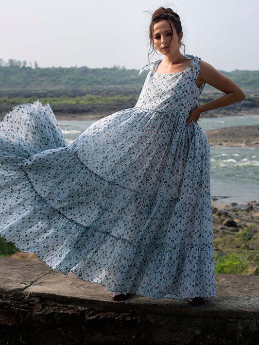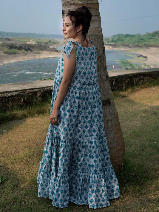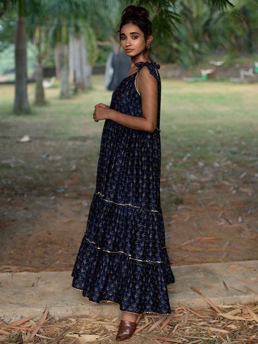 Indigo Block Printed Chanderi Tiered Dress
