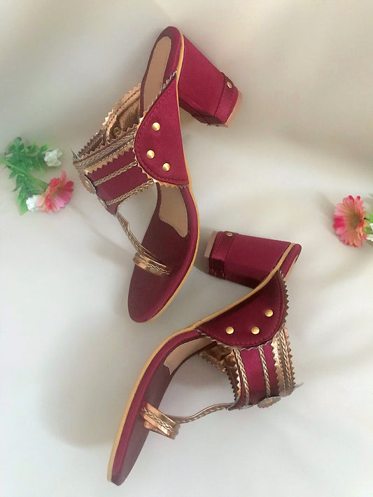 Gem Stone Maroon and Antqiue Gold Vegan Leather Block Heel