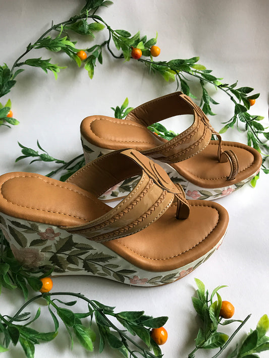 Nude Embroidered Leather Kolapuri Wedges