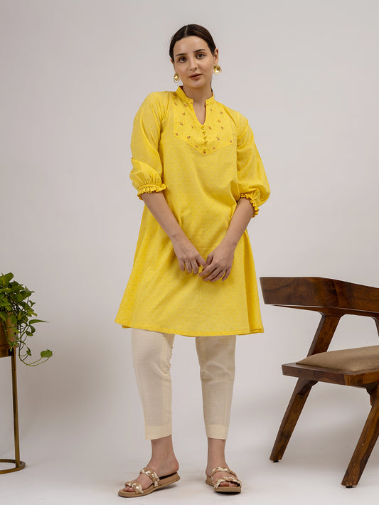Yellow Cotton Dobby Hand Embroidered Kurta