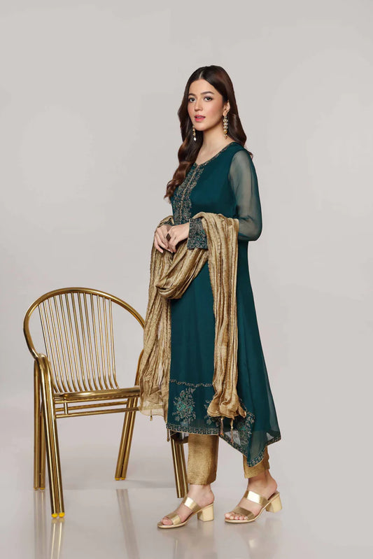 Green Embroidered Chanderi Cotton Suit - Set of 3