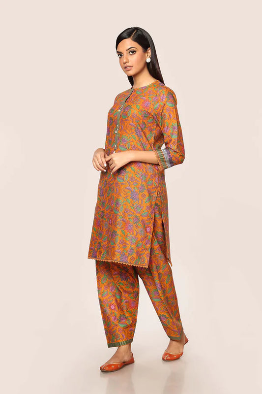Mustard Yellow Printed Cotton Kurta with Pants - Set of 2