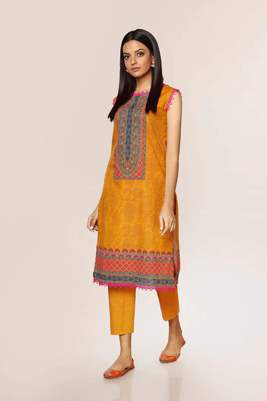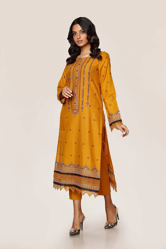 Yellow Embroidered Cotton Kurta with Pants - Set of 2