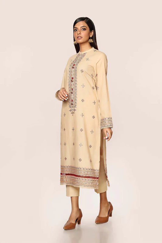 Beige Embroidered Cotton Kurta with Pants - Set of 2