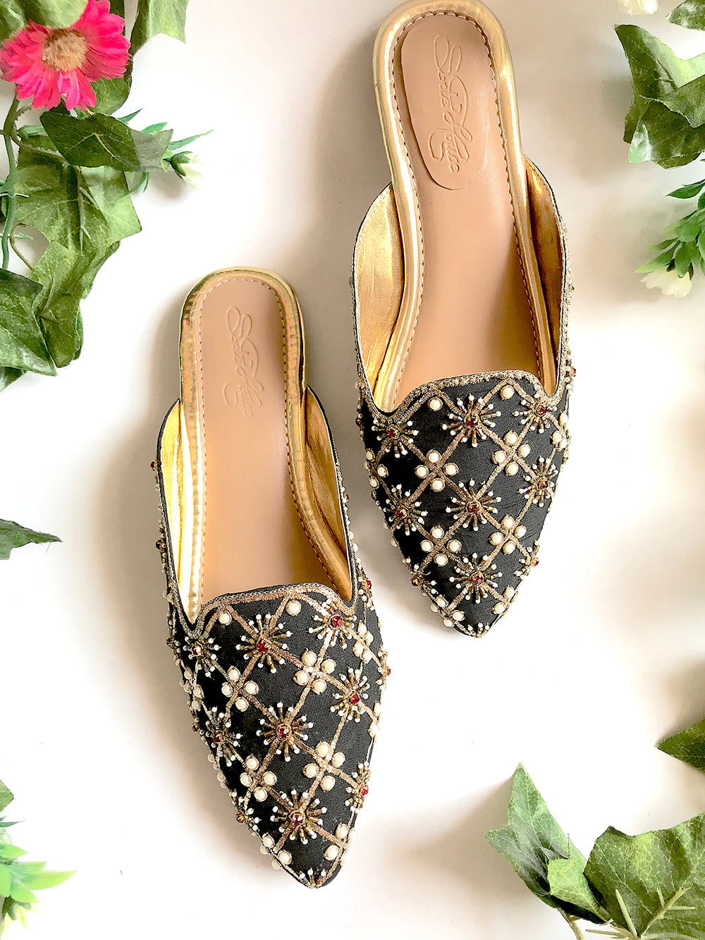 Description : Slip on Pointed loafers with soft Gold cushioning sole . Rich Jal of Gold Pittan work on Black color, with Deep maroon svaroswki stones with multi color kutdana finishing.