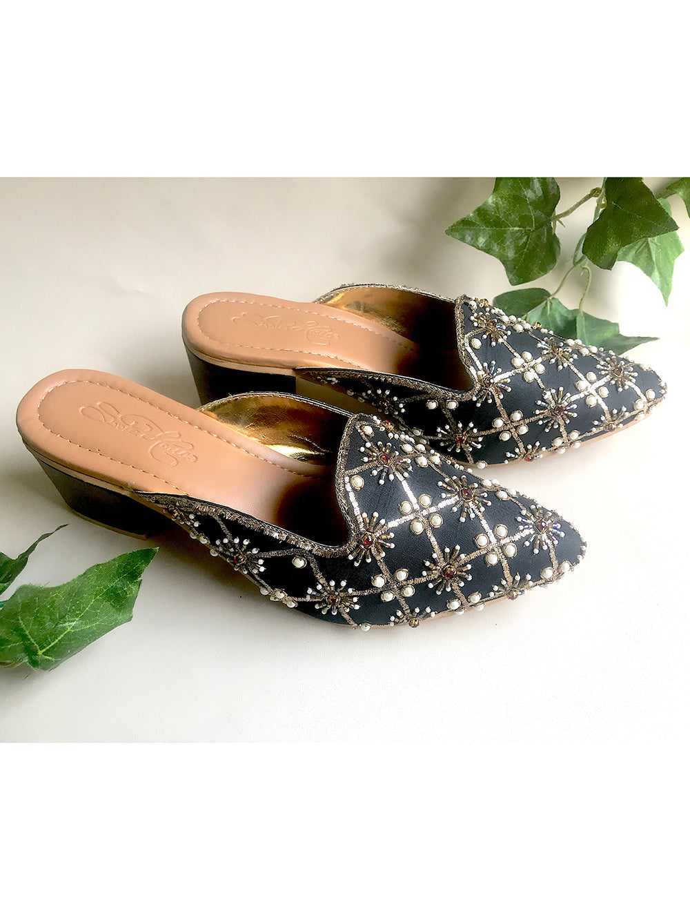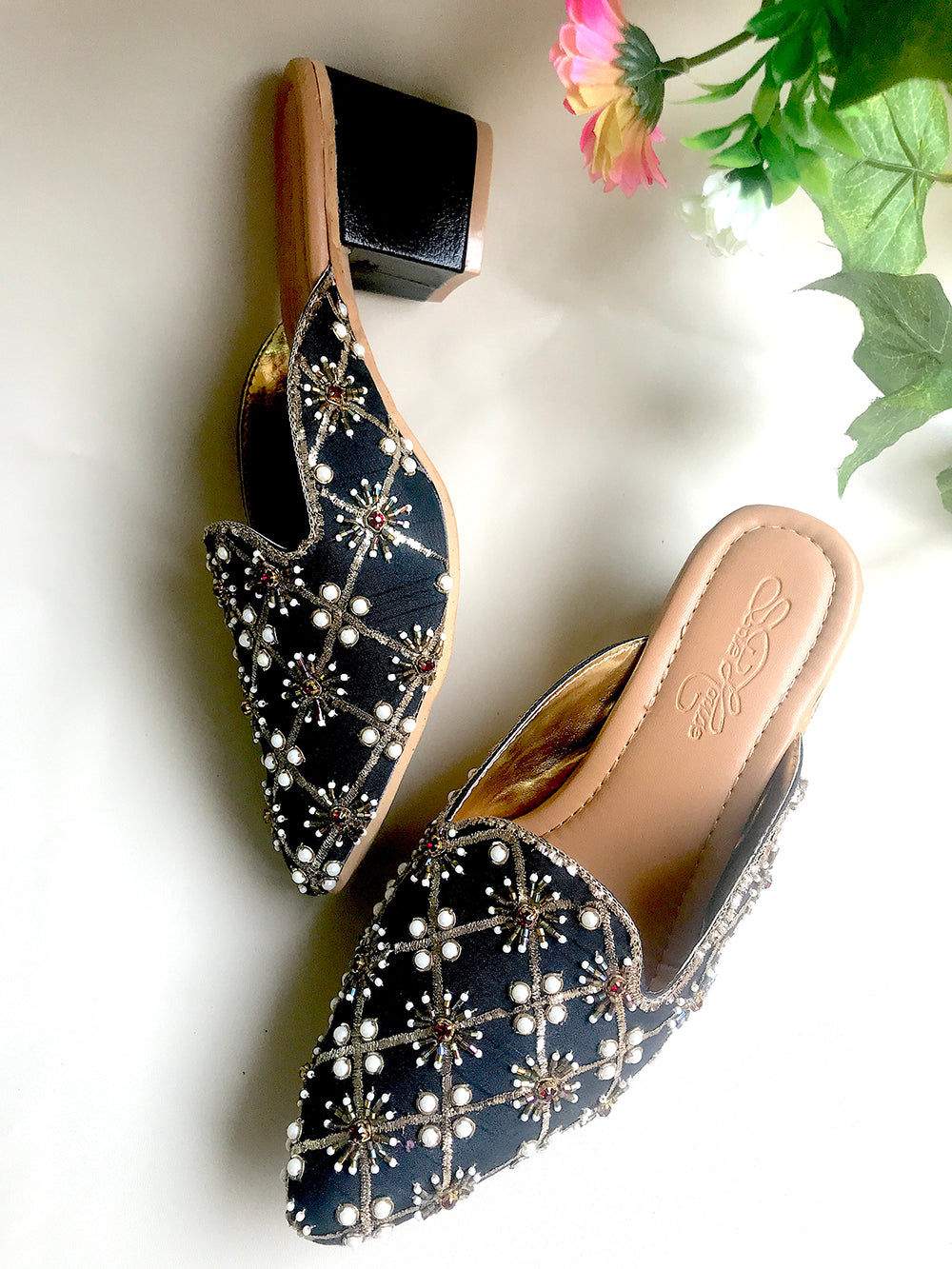 Description : Black Raw Silk with Gold Nakshi , Pittan work followed by Red Swarosvki Stones and Beige beads with 2 inch Comfort Box Heel .