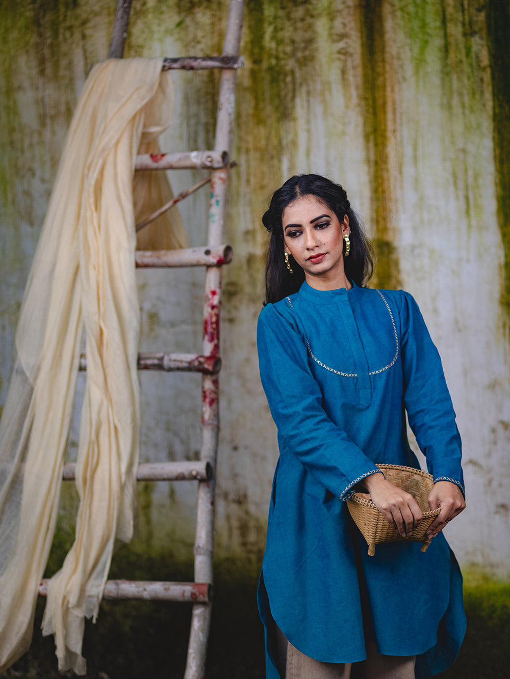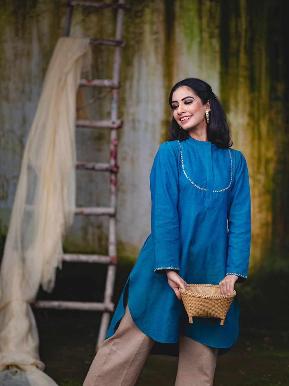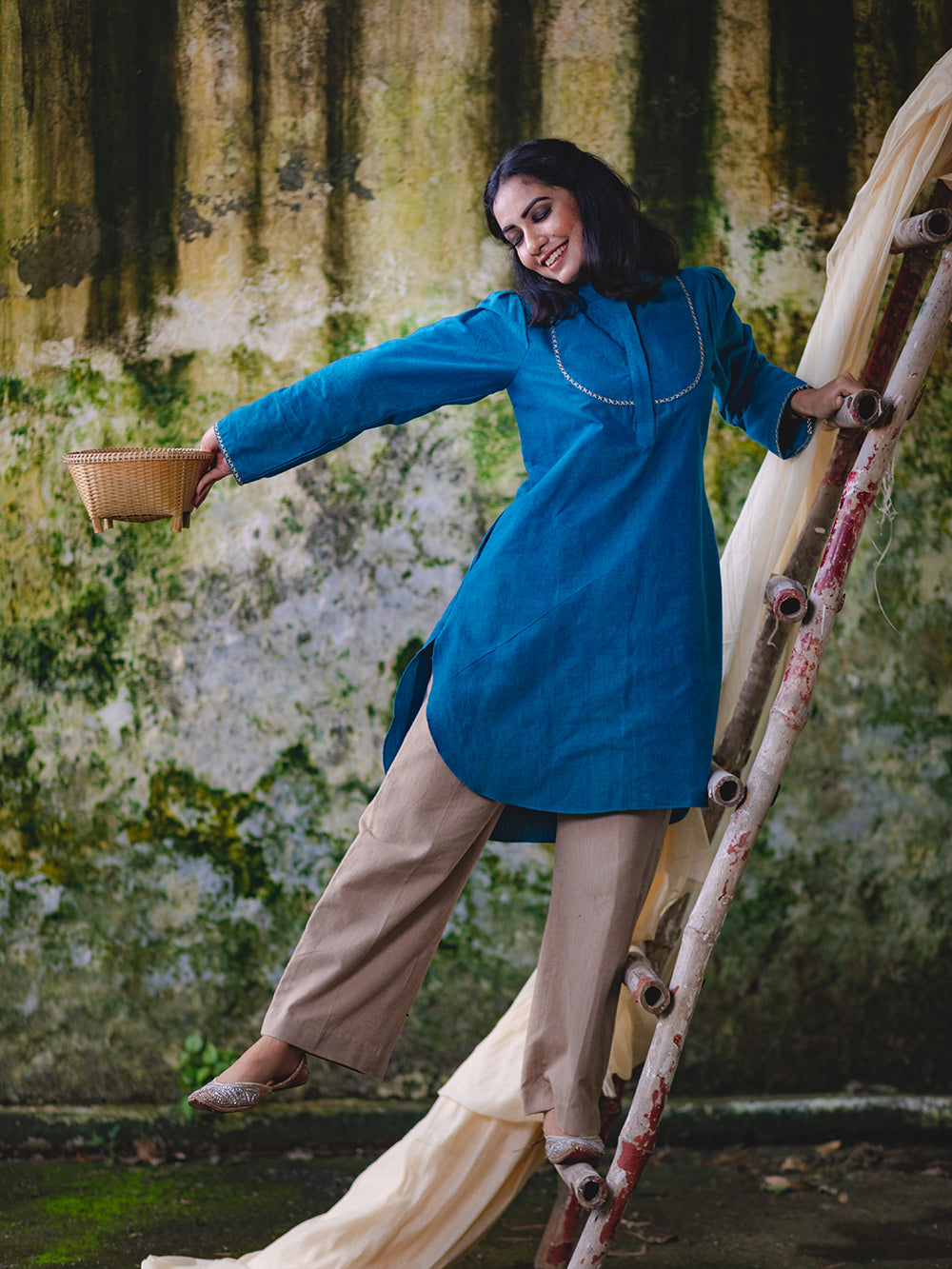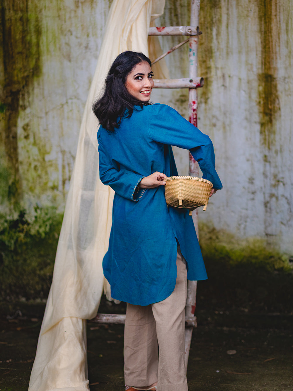 Description : Crafted in hand-woven cotton fabric, it features a front placket and yoke with subtle hand embroidery detail. It has a mandarin collar and hook closure. Wear it with our Tamanna pants for a very elegant look. Definitely our favourite outfit of the collection.