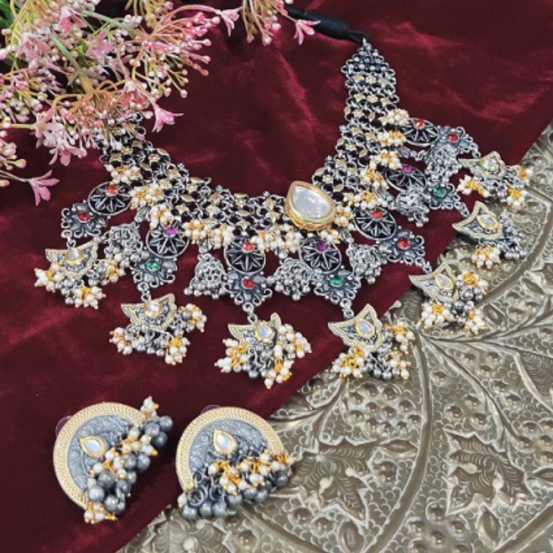 Description : Perfect set of necklace and earrings in golden color. Make it a permanent part of your jewellery collection. Style it over any ethnic-wear for festive occasion. It comes with a lobster lock with links for quick closure.