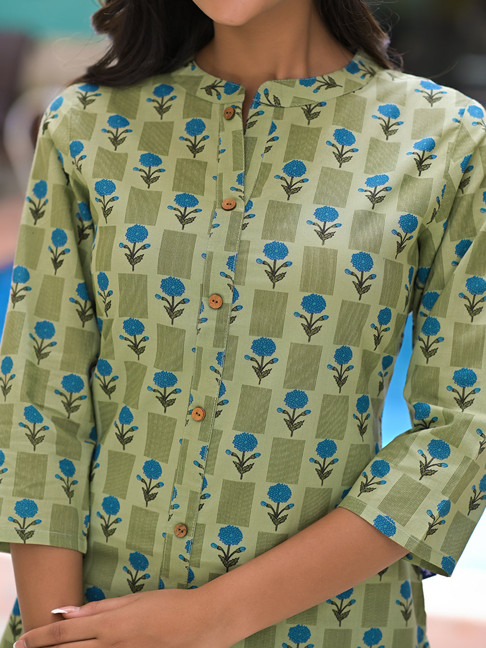 Green Cotton Printed Long Kurta with Palazzo- Set of 2