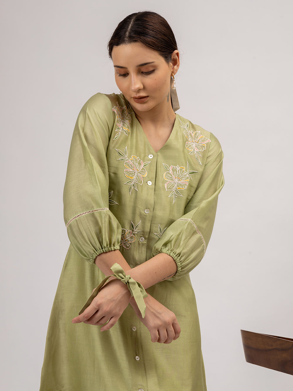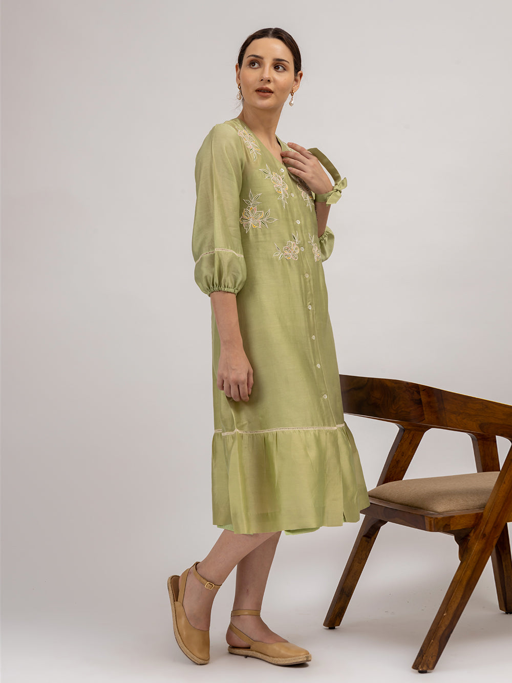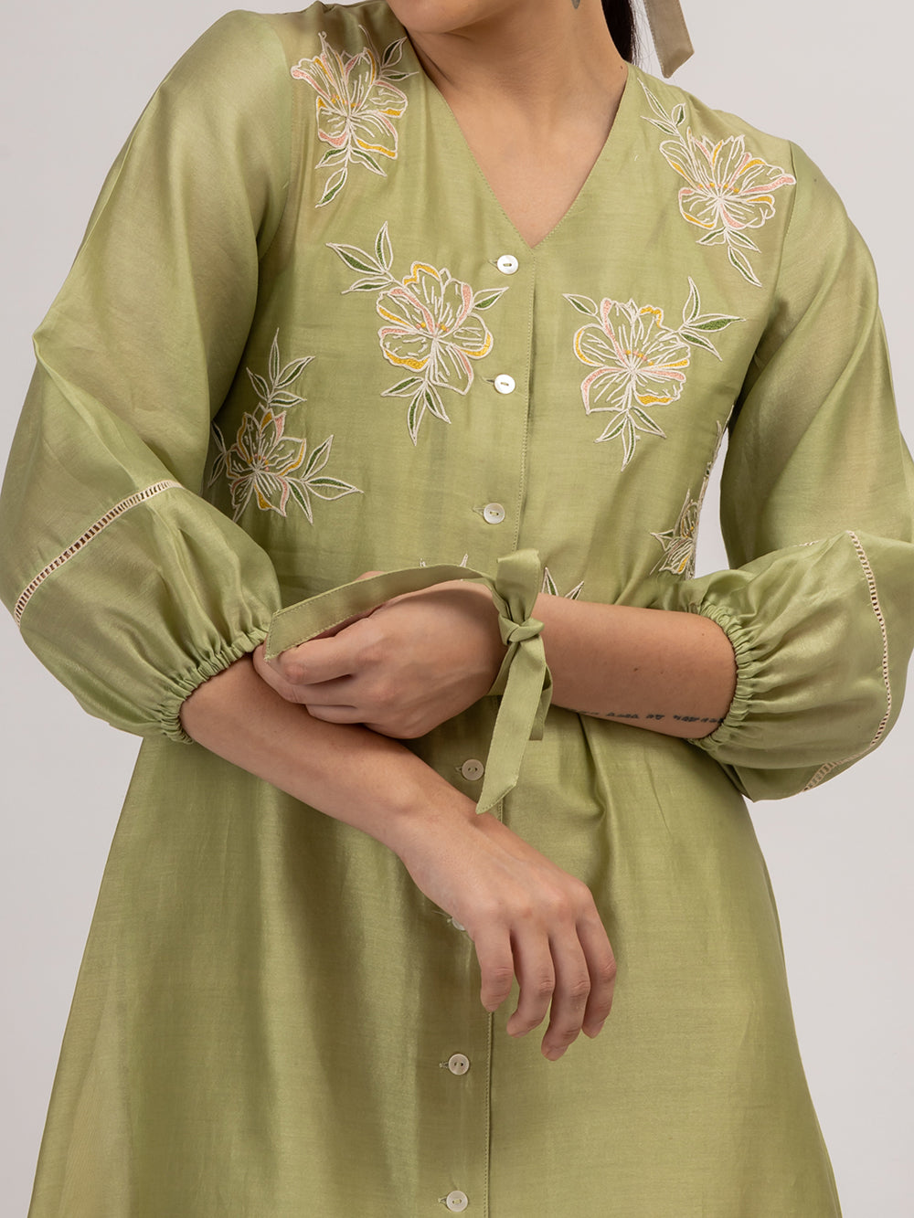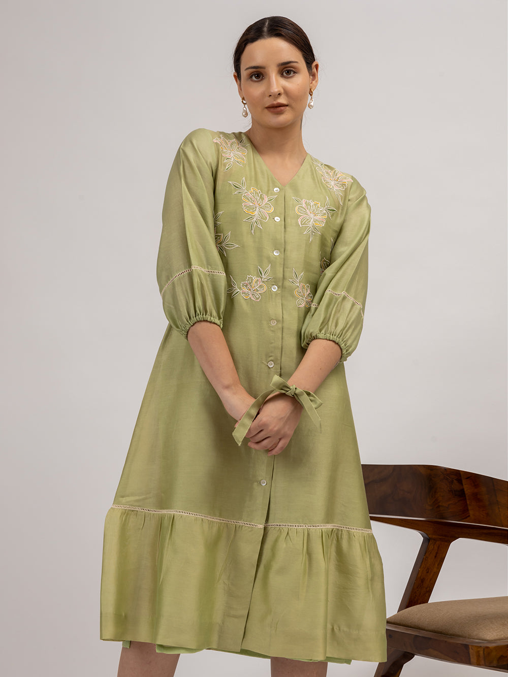 Description : Discover the allure of our Chanderi dress, exquisitely crafted in the most captivating shade of green. Adorned with intricate floral embroidery and delicate button details, this enchanting piece is a testament to timeless elegance. The dress features charming gathered sleeves embellished with insert lace, adding a touch of grace to its silhouette. Versatile and stylish, it can effortlessly transition from a dress to a jacket, making it a must-have addition to your wardrobe for any occasion.