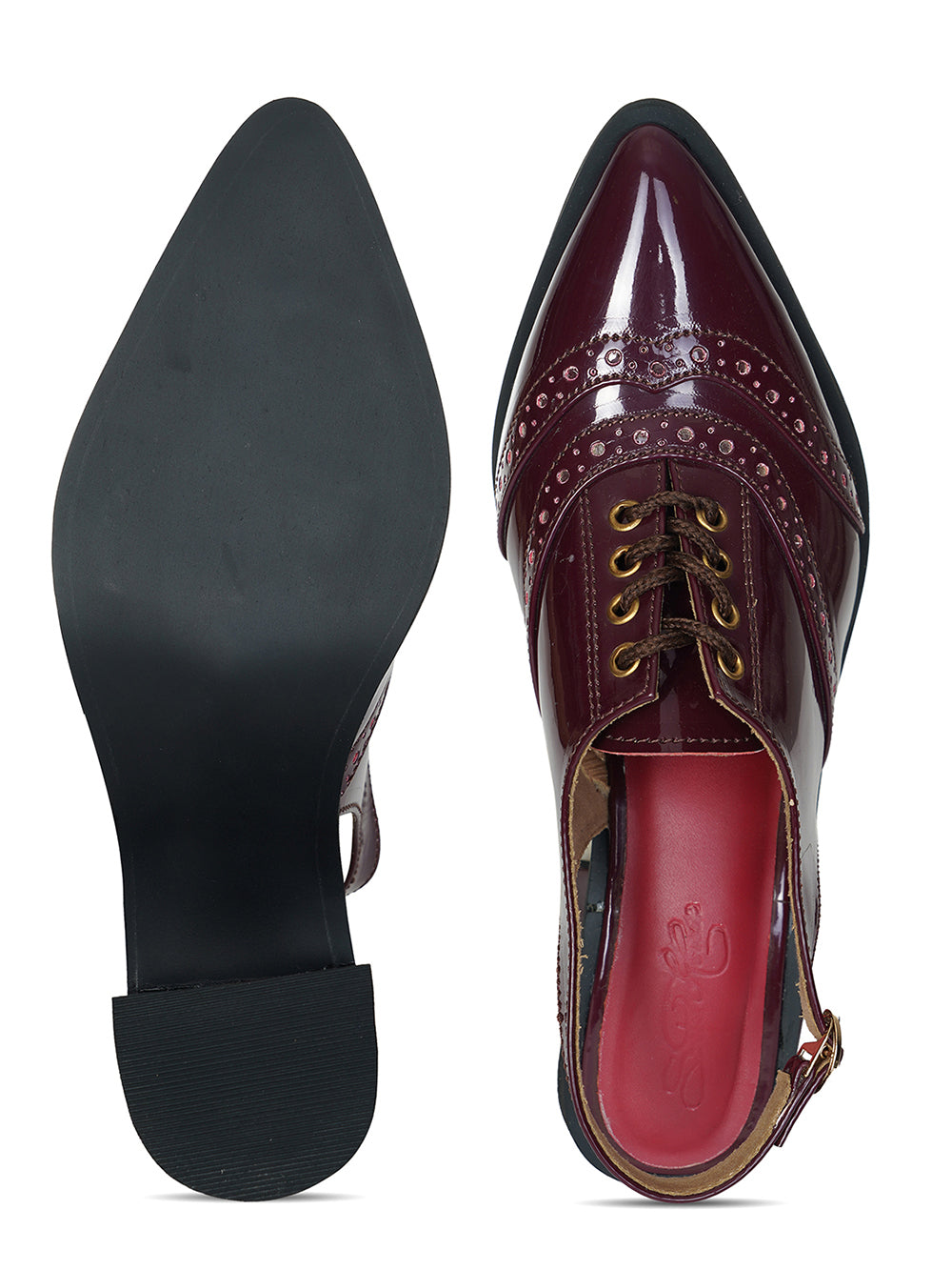 Description : Deep Maroon , Brouge Cutiing Sling Back with 3 inch Block Heels with comfort grip .