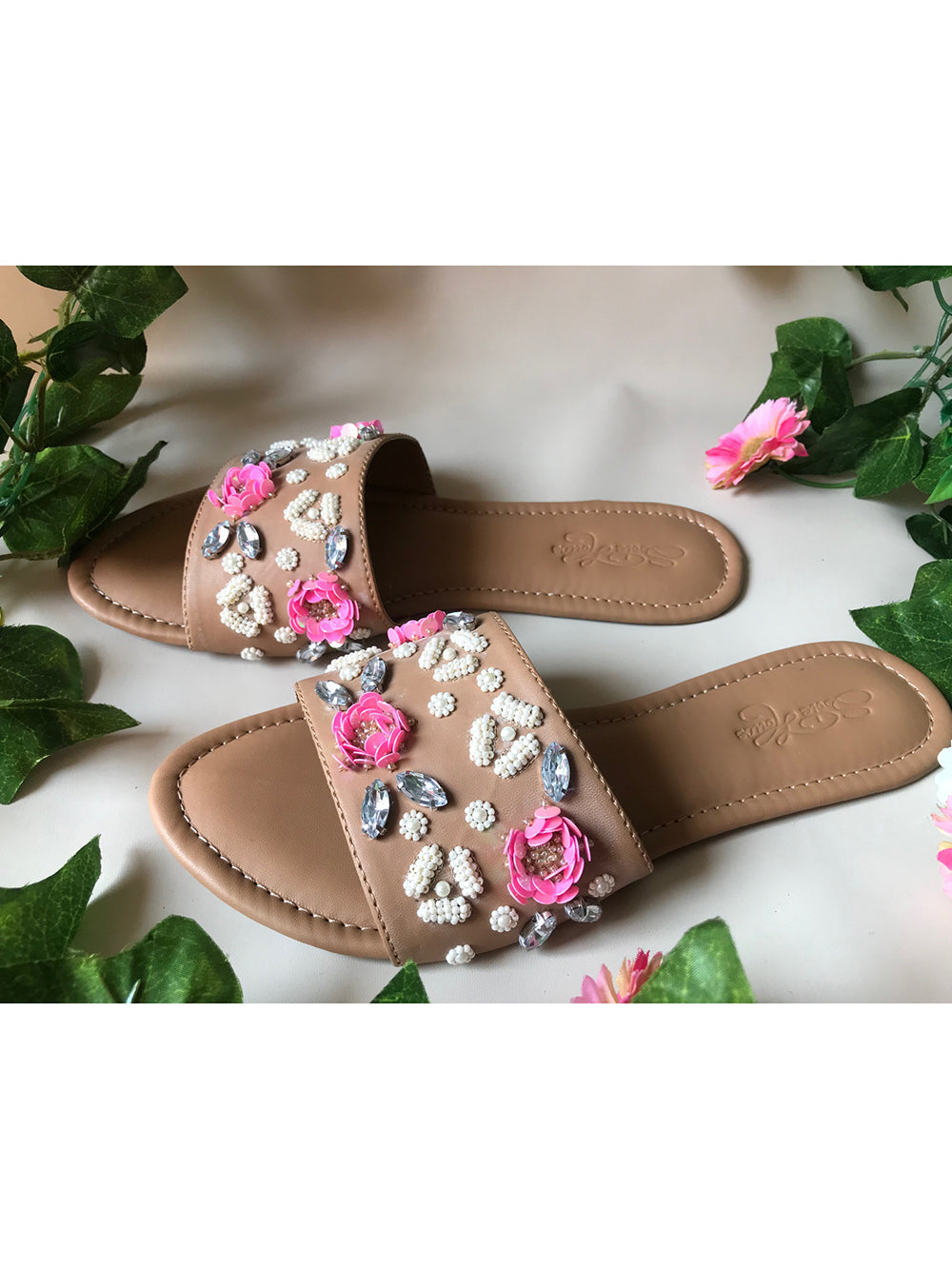 Description : Nude Vegan Leather with Pink Sequin and Pearl flowers with Almond Shape Rhinestones.