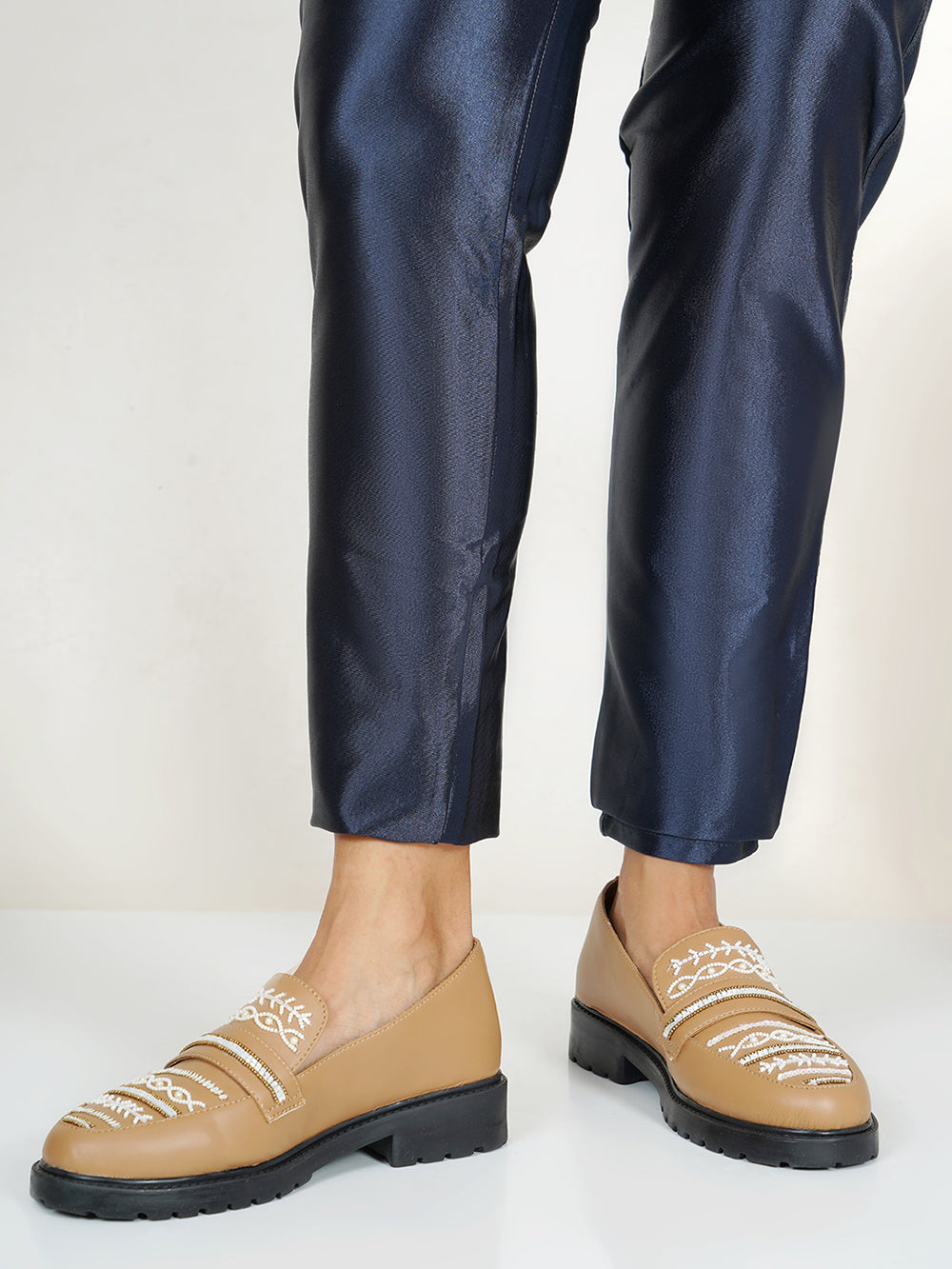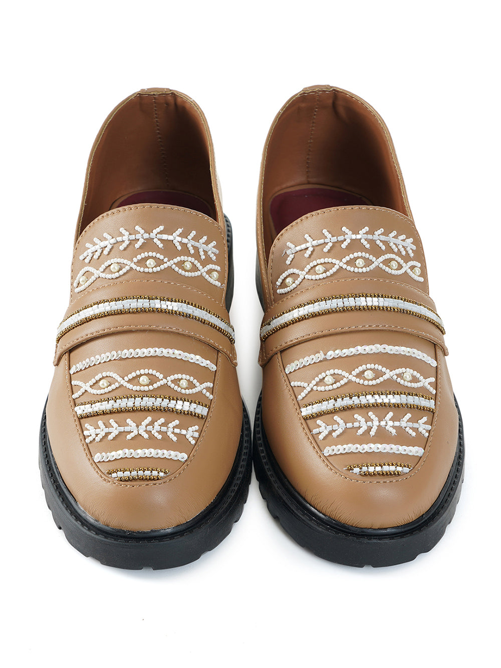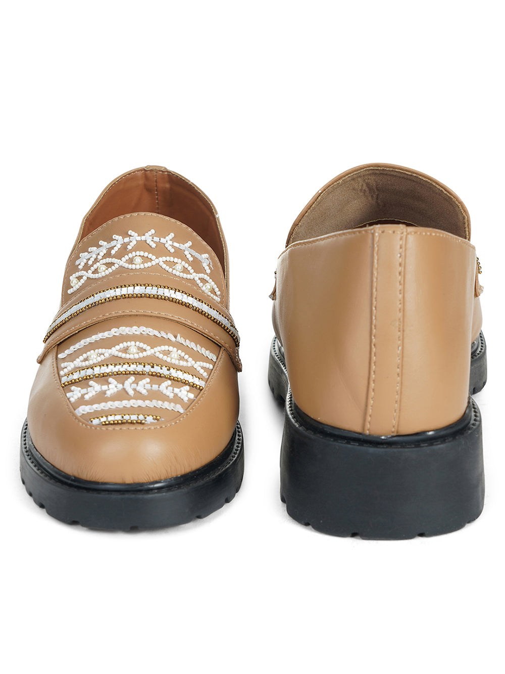 Description : Nude Loafers with Off White Mix Media hadcrafted embroidery with comfort grip .