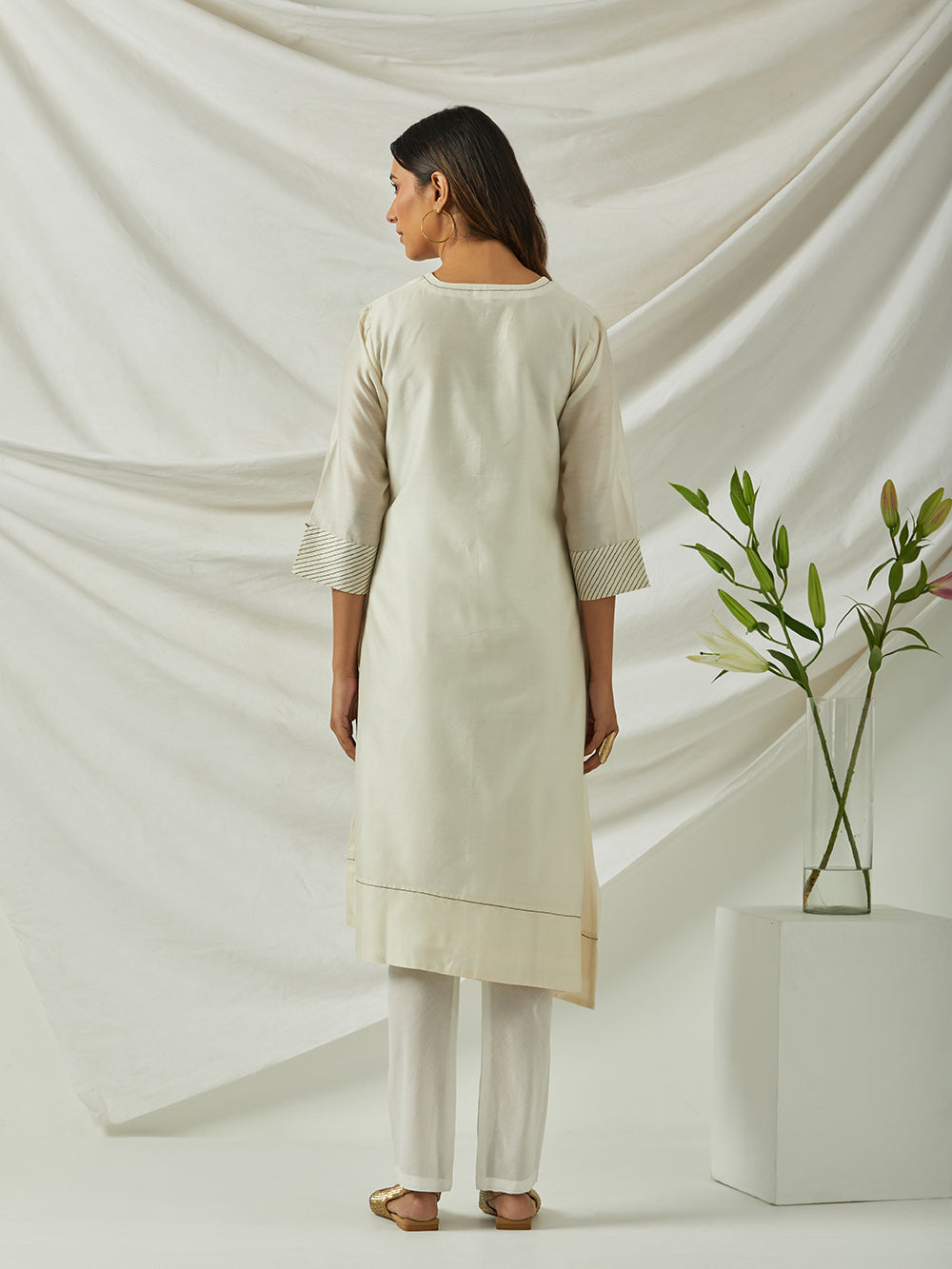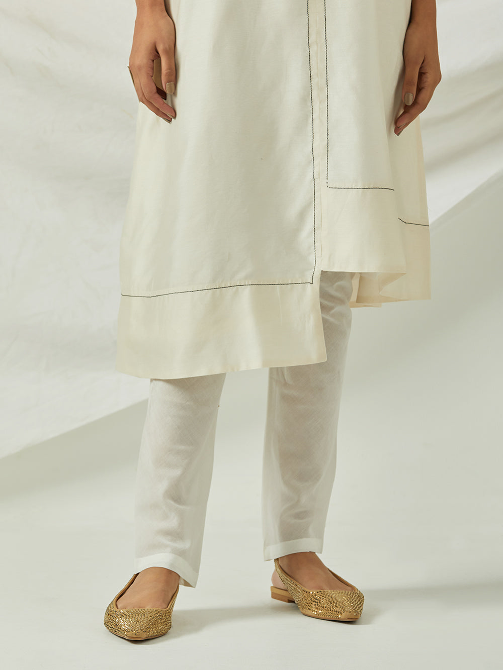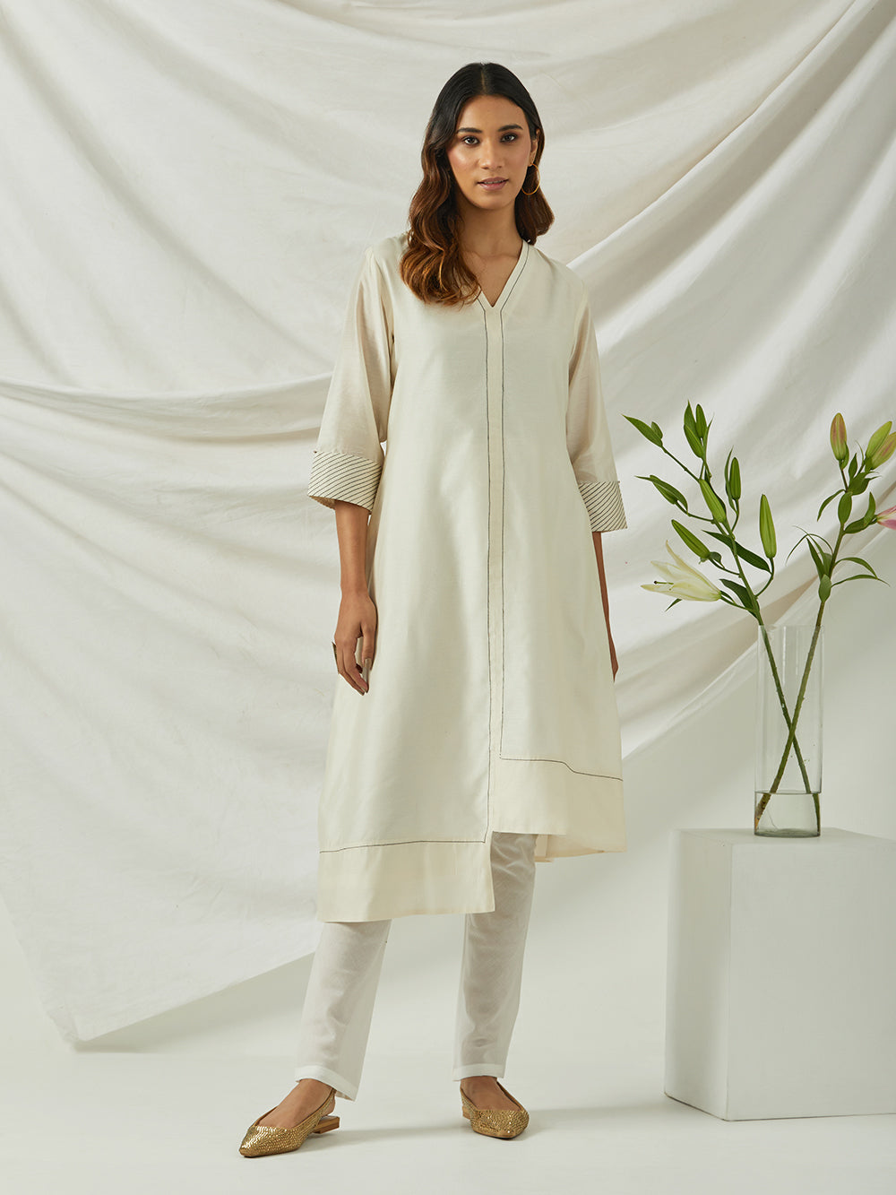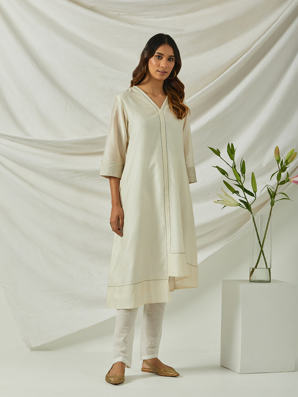 Description : Discover elegance in simplicity with our Off White Chanderi Kurta featuring a V-neckline and 3/4th sleeves. Its asymmetric hemline adds a modern touch, while delicate embroidery adorns the sleeves hem and front kurta. Elevate your wardrobe with this timeless piece.