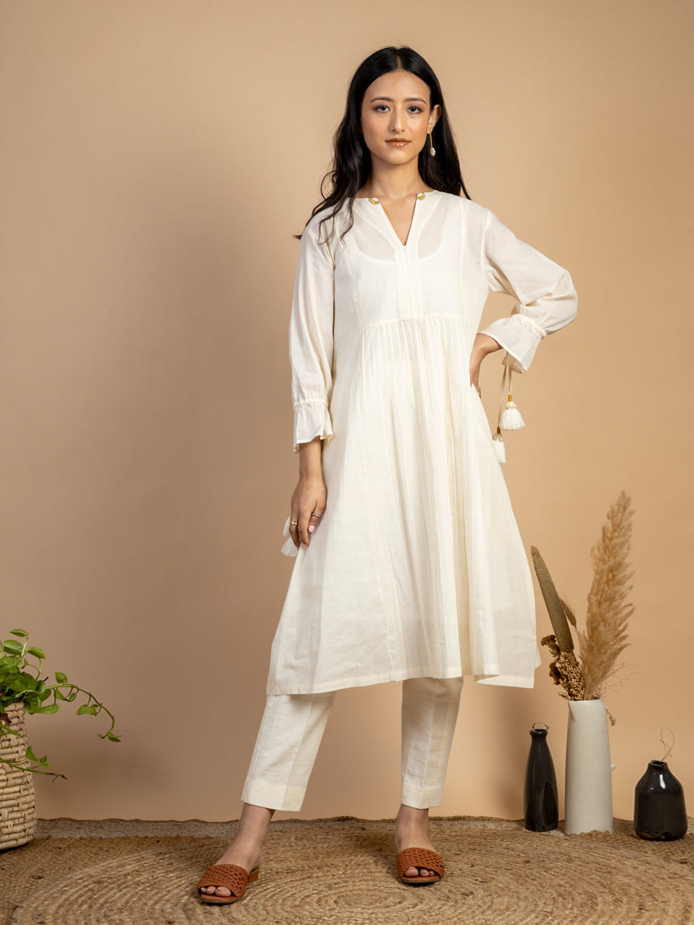 Description : Our Esha piece is simple yet very elegant and stylish. It also features front paneling with pintuck detail. Tassel detail at the sleeves and hand embroidered flowers at the neck enhance the beauty of a simple piece. Features side pockets.