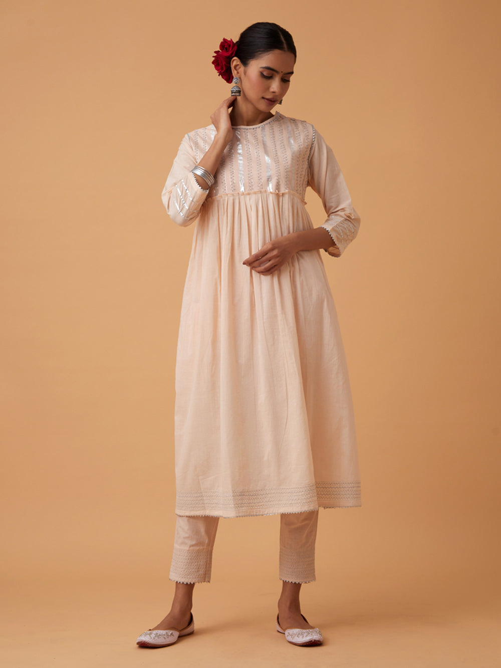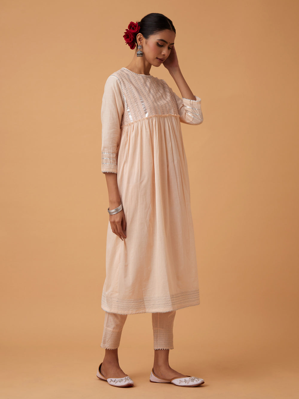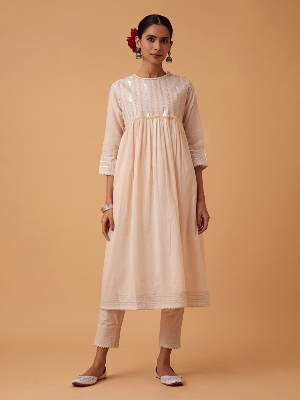 Description : A gathered calf length powder kurta made in soft cotton with delicate silver embroidery and beadwork on the yoke. This dress has a shoulder opening and 3/4th sleeves are hemed with a beautiful gold lace. This kurta comes with matching comfortable pants which has a soft elasticated drawstrings for adjustment.
