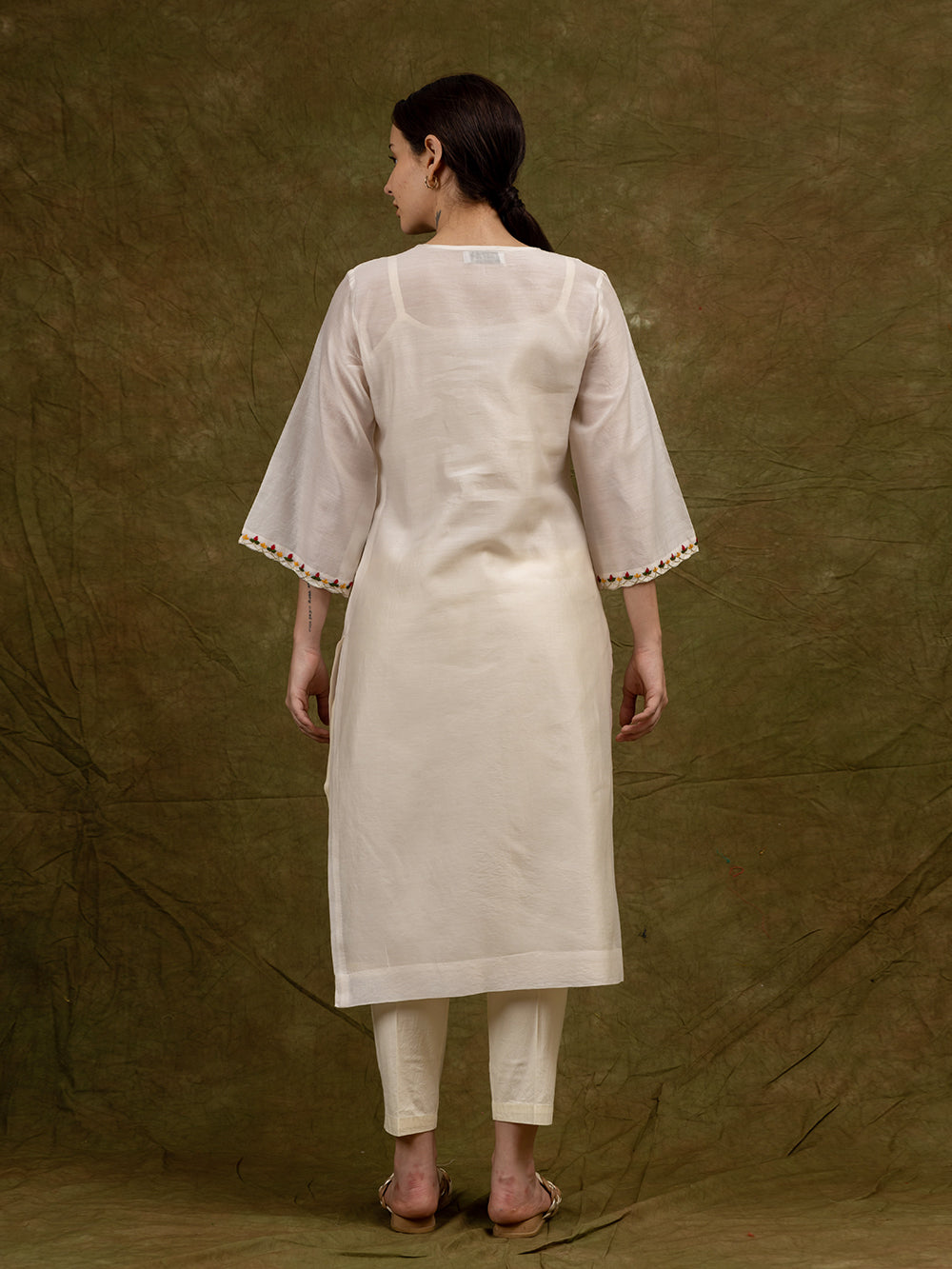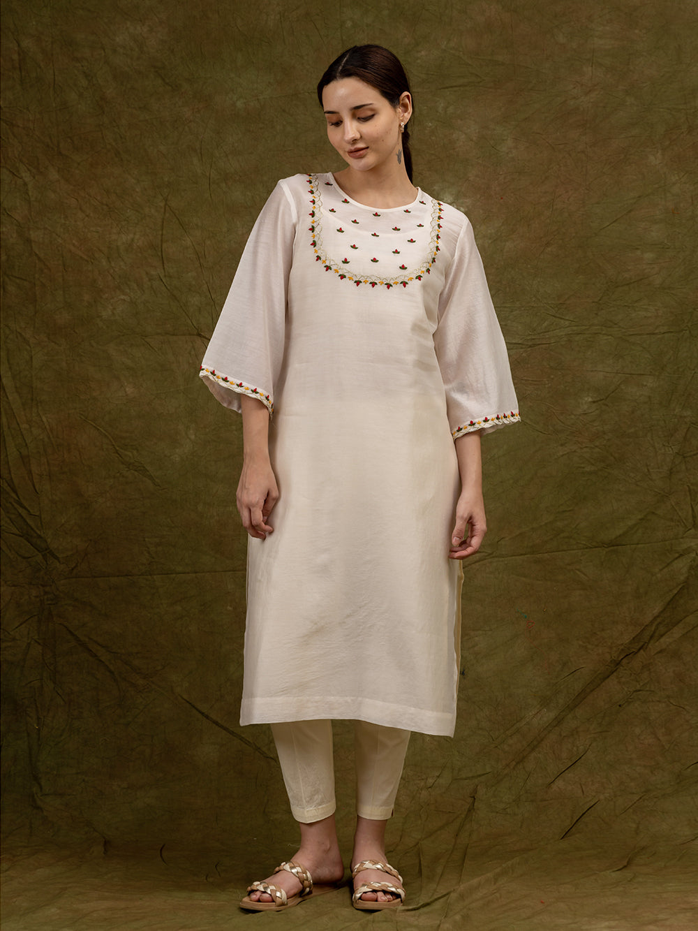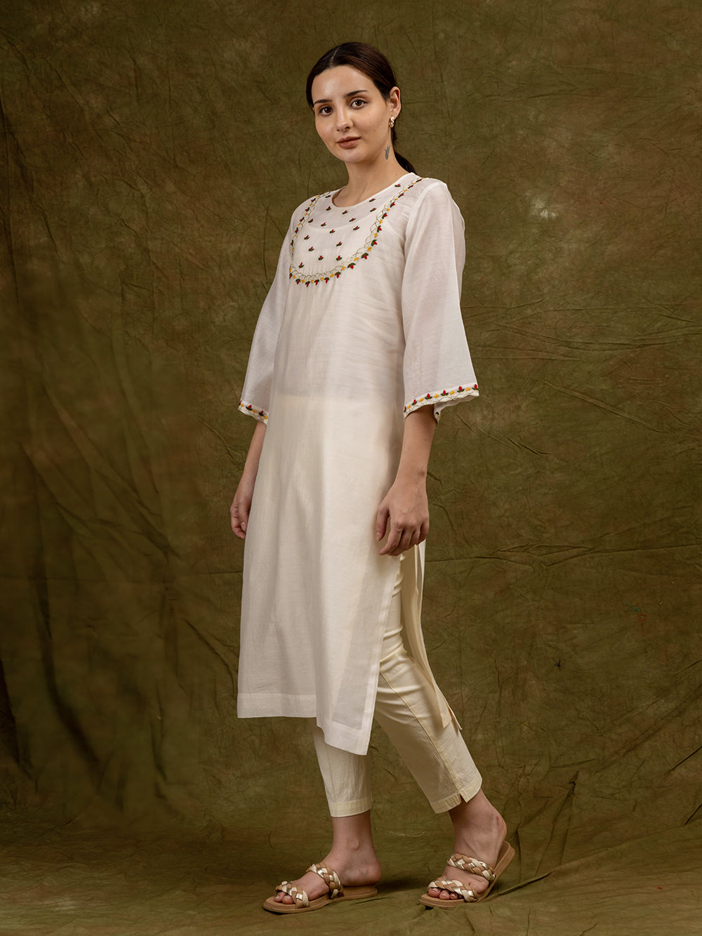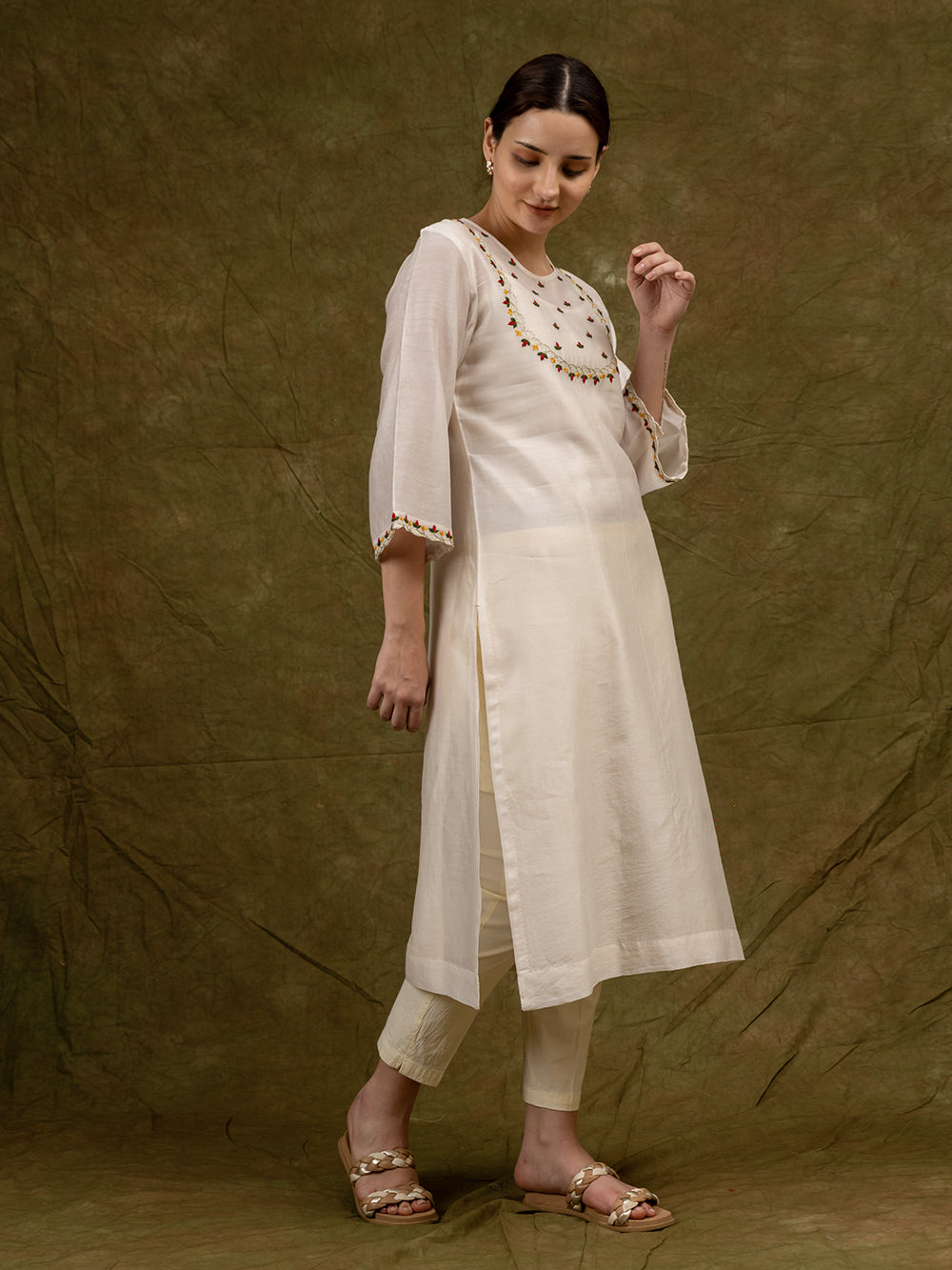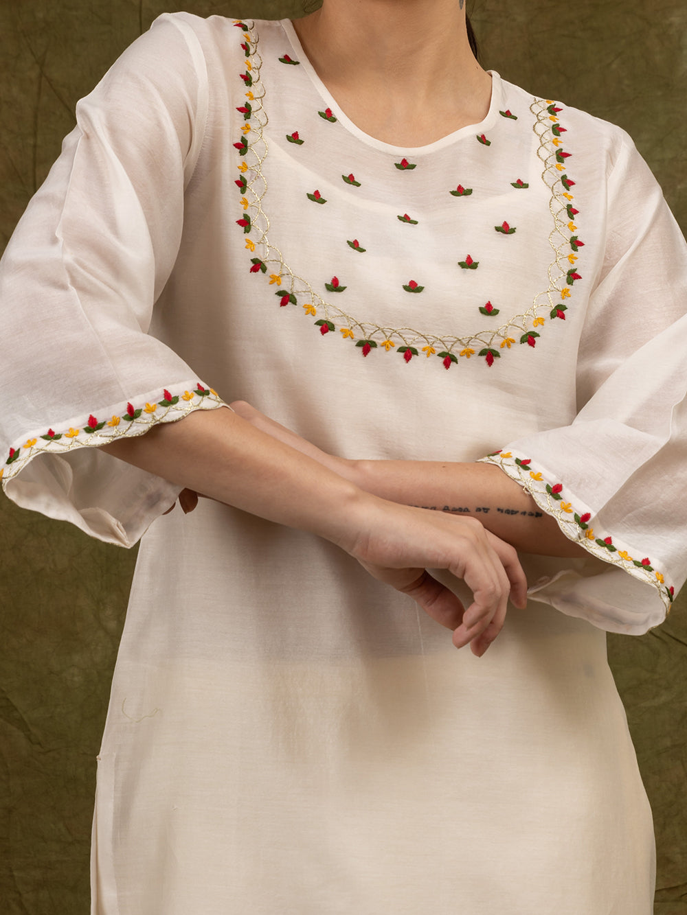 Description : Add more to your beauty and grace with this lovely white chanderi kurta. This chanderi kurta has elegant hand embroidery around the neck and sleeves.
