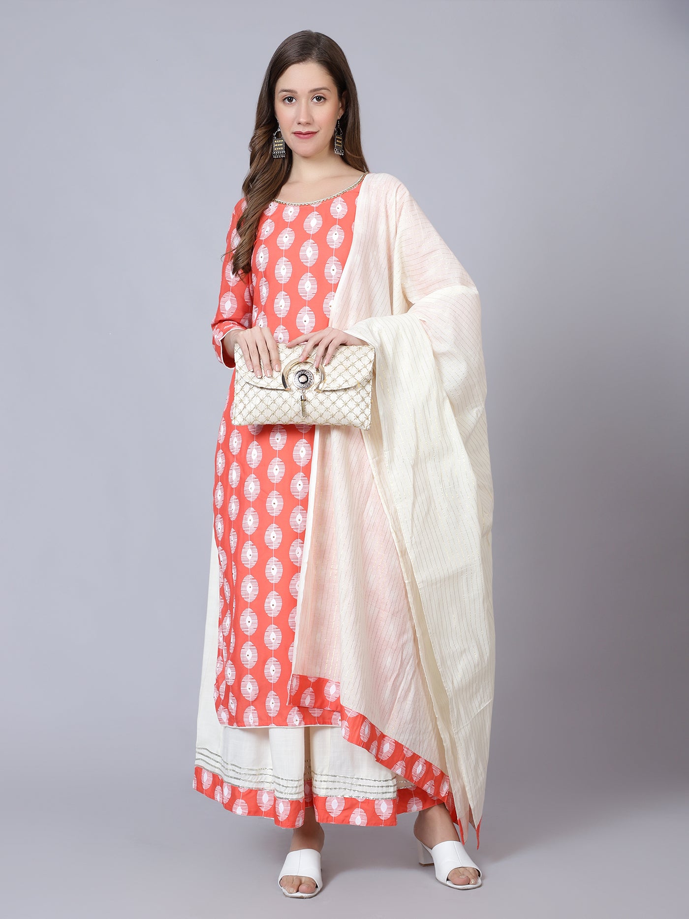 Description : Elevate your wardrobe with our captivating kurta set, featuring intricate all-over print and exquisite embroidery, complemented by a graceful dupatta and chic sharara. Shop now for timeless elegance!.