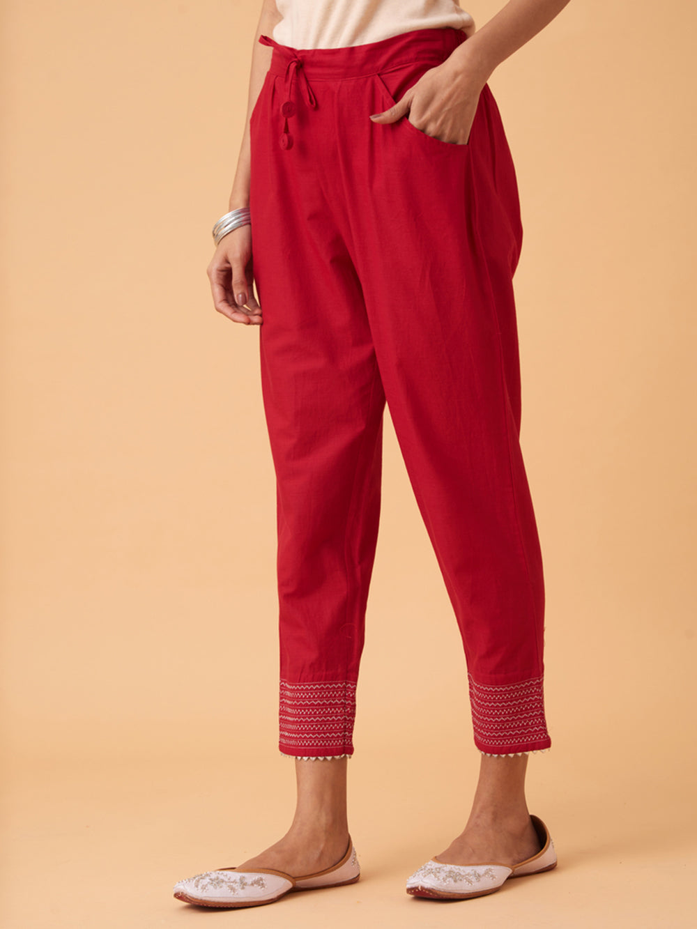 Description : A gathered calf length red kurta made in soft cotton with delicate silver embroidery and beadwork on the yoke. This dress has a shoulder opening and 3/4th sleeves are hemed with a beautiful gold lace. This kurta comes with matching comfortable pants which has a soft elasticated drawstrings for adjustment.