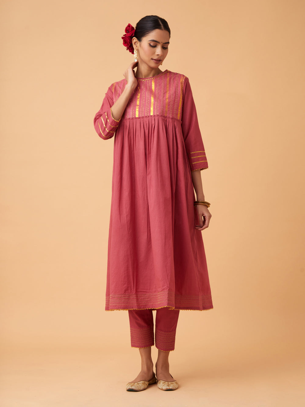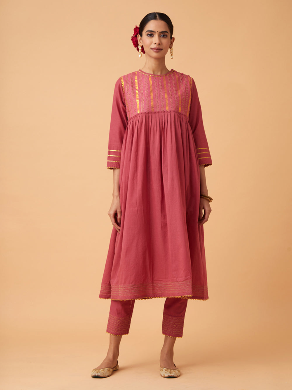Description : A gathered calf length spice kurta made in soft cotton with delicate gold embroidery and beadwork on the yoke. This dress has a shoulder opening and 3/4th sleeves are hemed with a beautiful gold lace. This kurta comes with matching comfortable pants which has a soft elasticated drawstrings for adjustment.