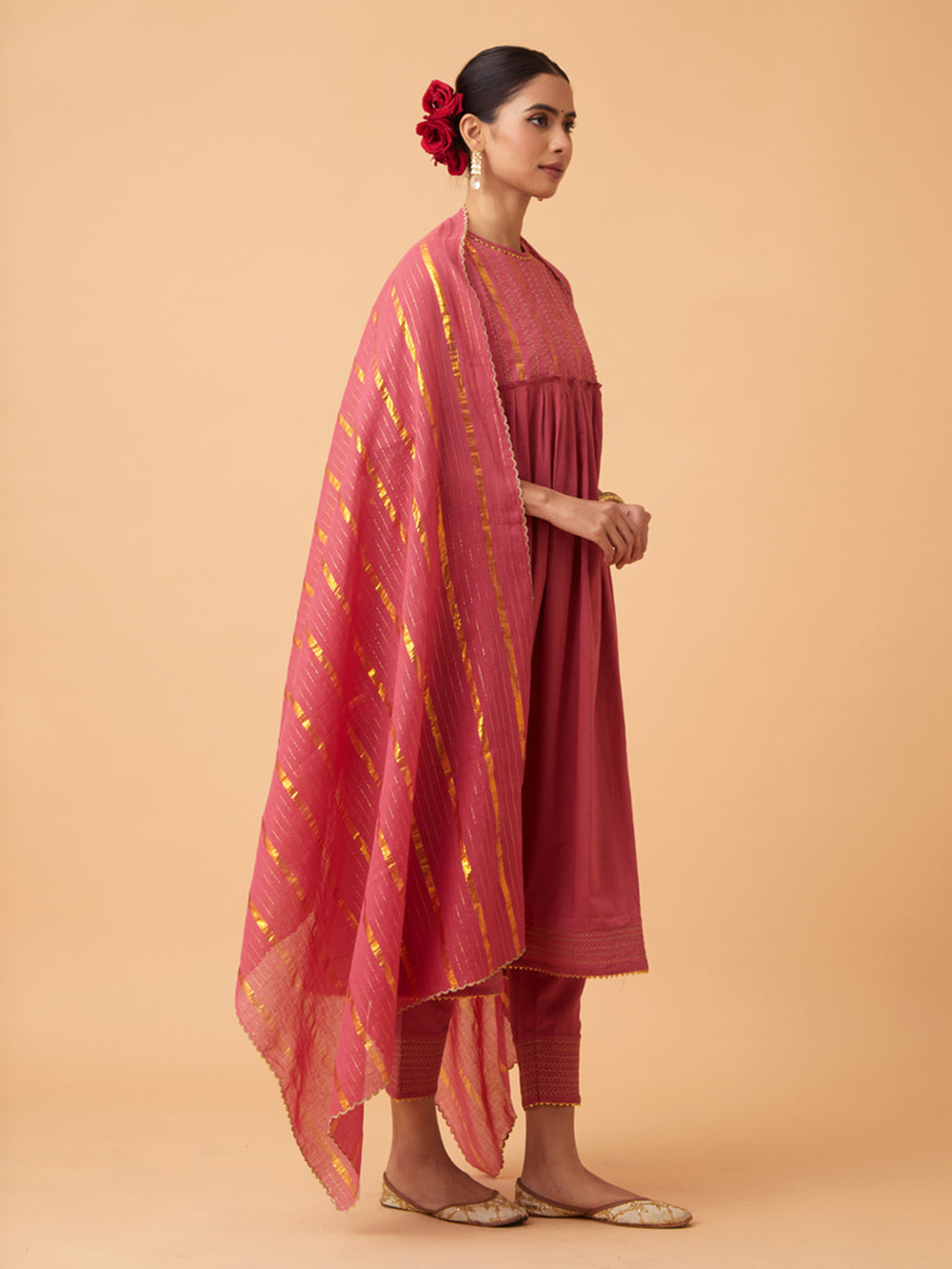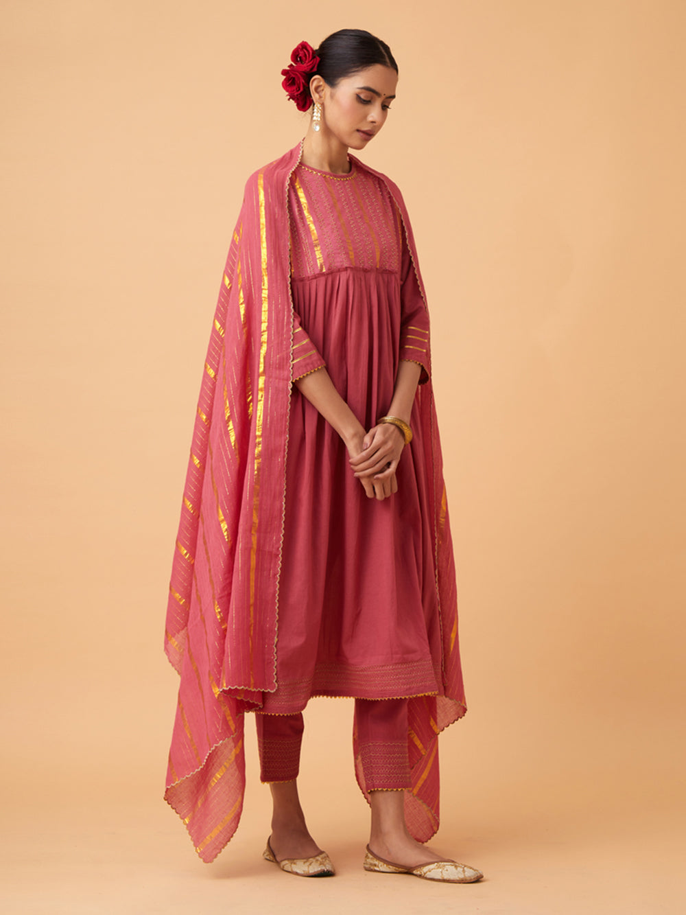 Red Cotton Kurta with Pants and Dupatta Set of 3