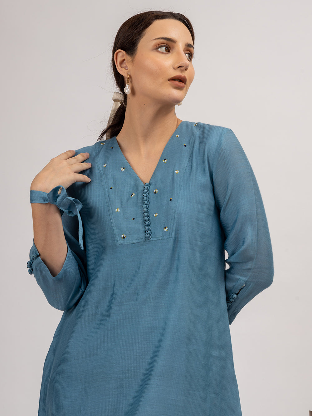 Description : Our easy breezy Maheshwari silk dress/kurta with front yoke features hand embroidered roses and potli buttons. It's V-neck design with 3/4thsleeves adds to the comfort of wearing it.