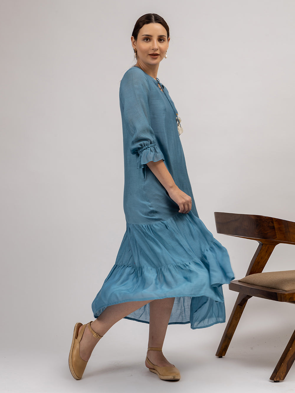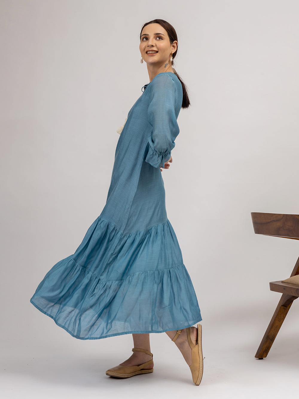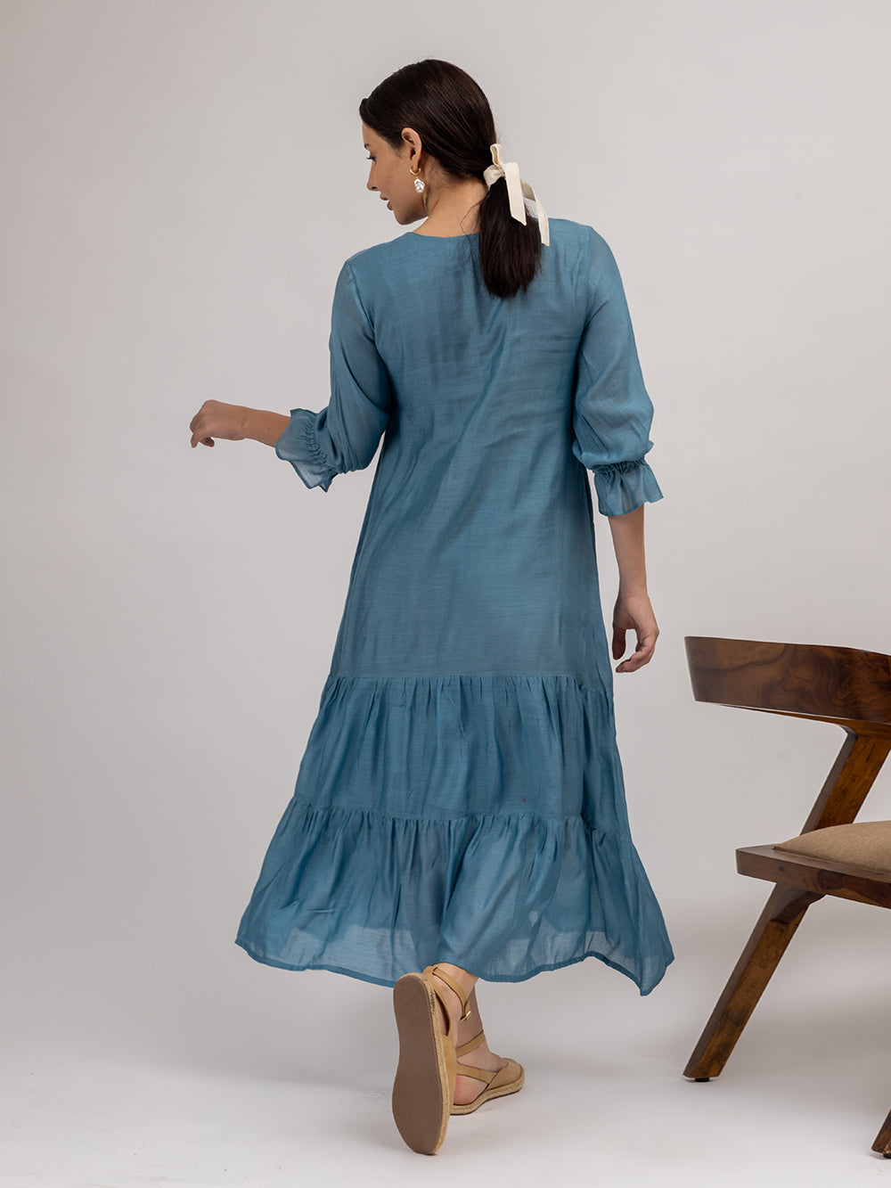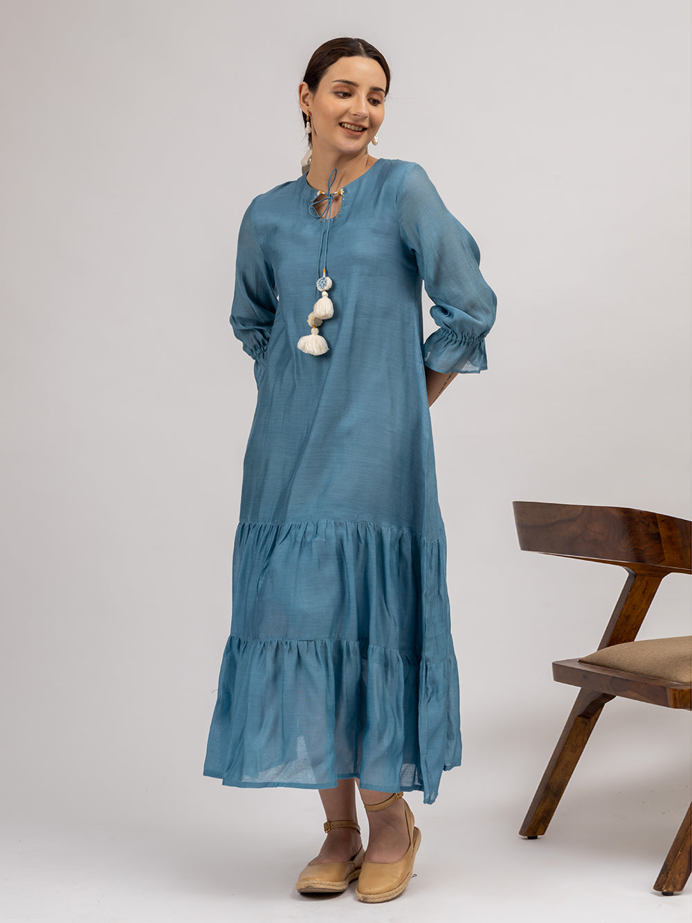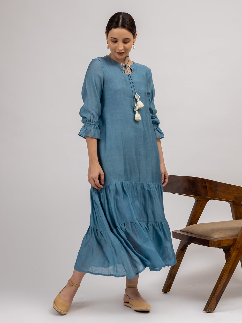 Description : Our easy breezy Maheshwari Silk tier dress comes with a round keyhole neck. It features beautiful handmade tassels at the neckline. The beauty of this piece lies in the flowers and French knots hand embroidered at the keyhole. The sleeves are 3/4th and elasticated near the hem. This piece is made with love in the beautiful shade of blue-grey. A perfect pick for a casual outing or a holiday.