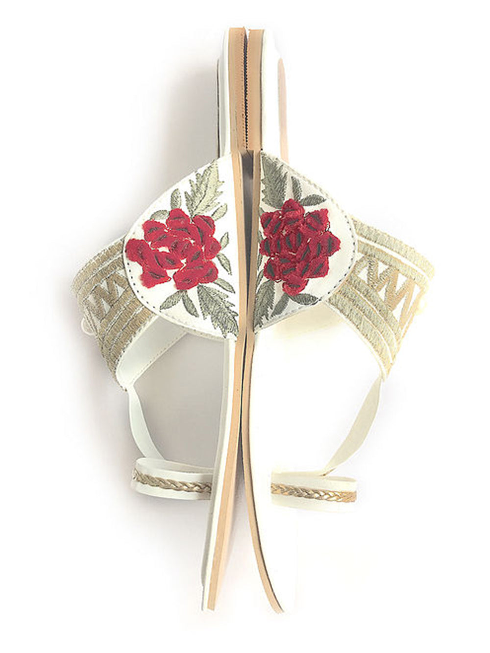 Description : Traditional Zari work Kolapuri with contempory velvet cut Rose in Red and White Kolapuri Flats .Gold plaid detailing with comfort sole.