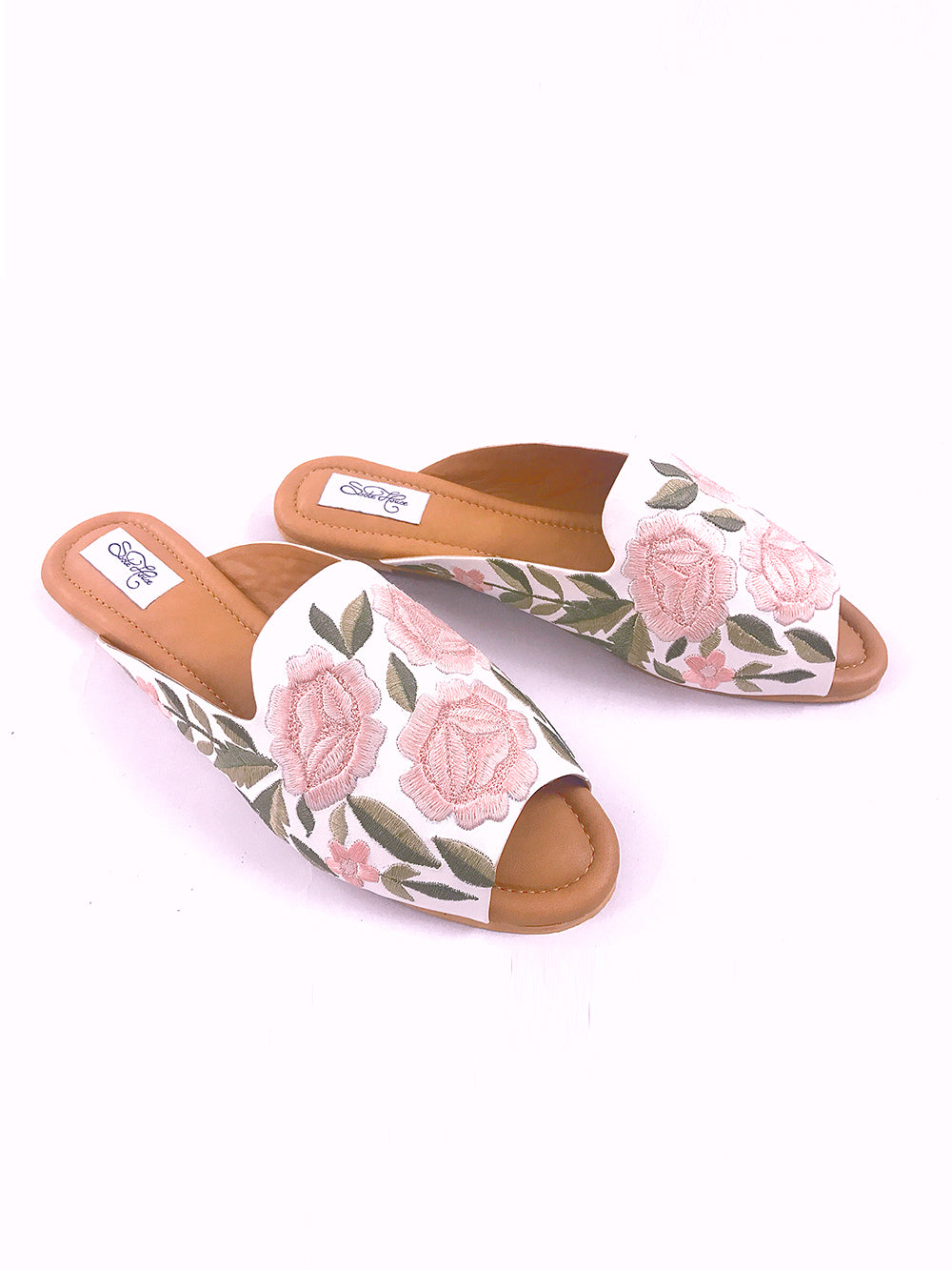 Description : White Loafers with Peach and Pink Flowers with Two Tone Green Leaves.